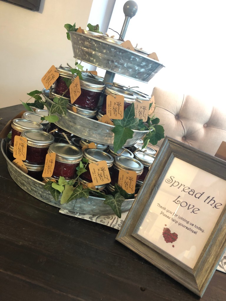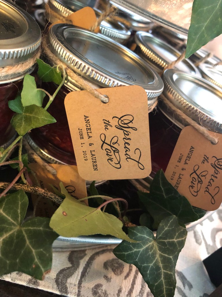 My mom made homemade raspberry jam, we canned them in mini jars and tagged it with a “Spread the Love” note for everyone to take home. We displayed them on the dining room table, along with the gifts and a personal touch of crystals. It was a beautiful day to take family photos and celebrate the brides to be!