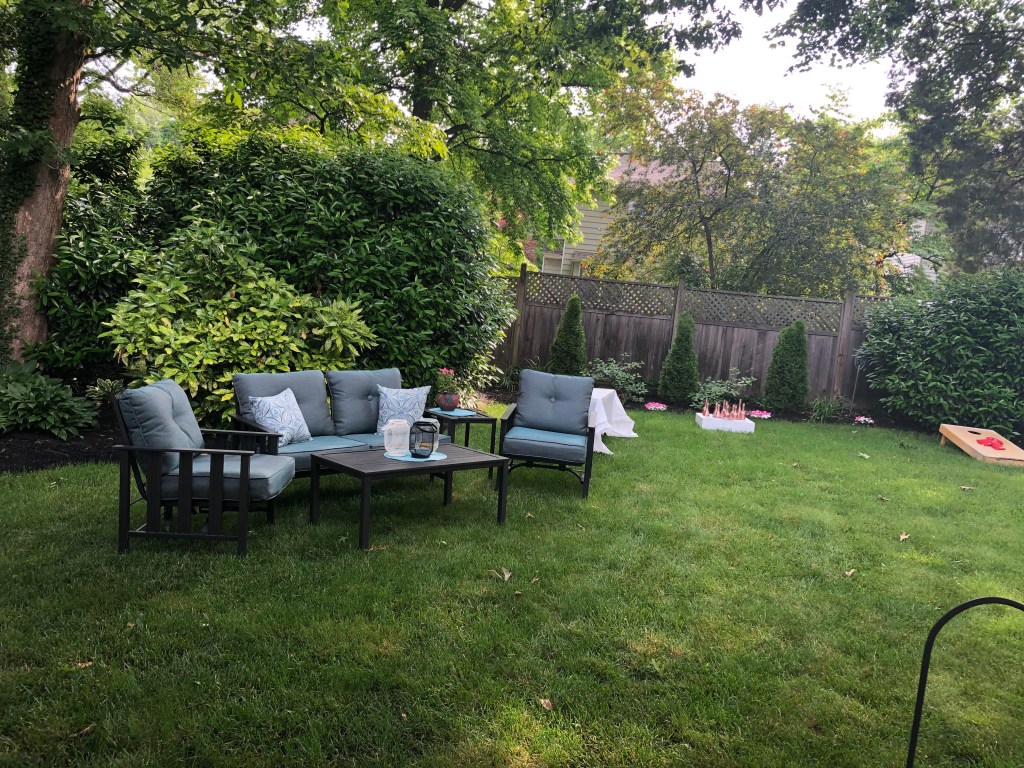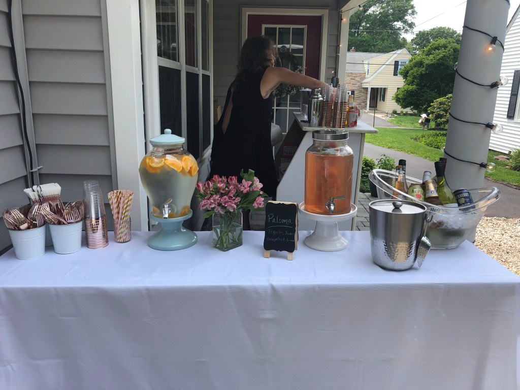 A big charcuterie board was made and we put apps out on the island, had the Chipotle set up as a buffet, set up a side bar on the small porch, and utilized the large patio to set up the tables and chair under a tent. To create more space for our guests, some of the patio furniture was moved out to the lawn, along with yard games for everyone to play. We wanted to create an open and inviting area for all of our guests to mingle and meet before the big day.